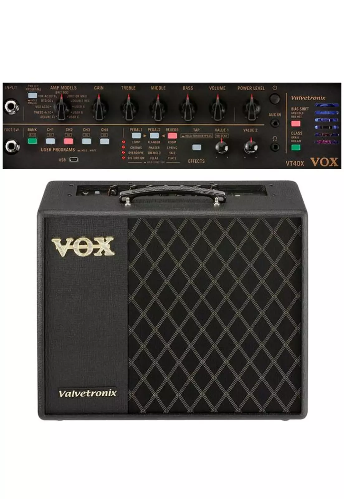 El VOX VT40X incorpora una variedad de modelos de amplificadores y efectos integrados. Esto permite recrear sonidos clásicos de amplificadores de válvulas, así como tonos modernos con alta ganancia. Su sistema de modelado digital ofrece respuesta rápida y natural al tocar, manteniendo la claridad y el carácter del instrumento.