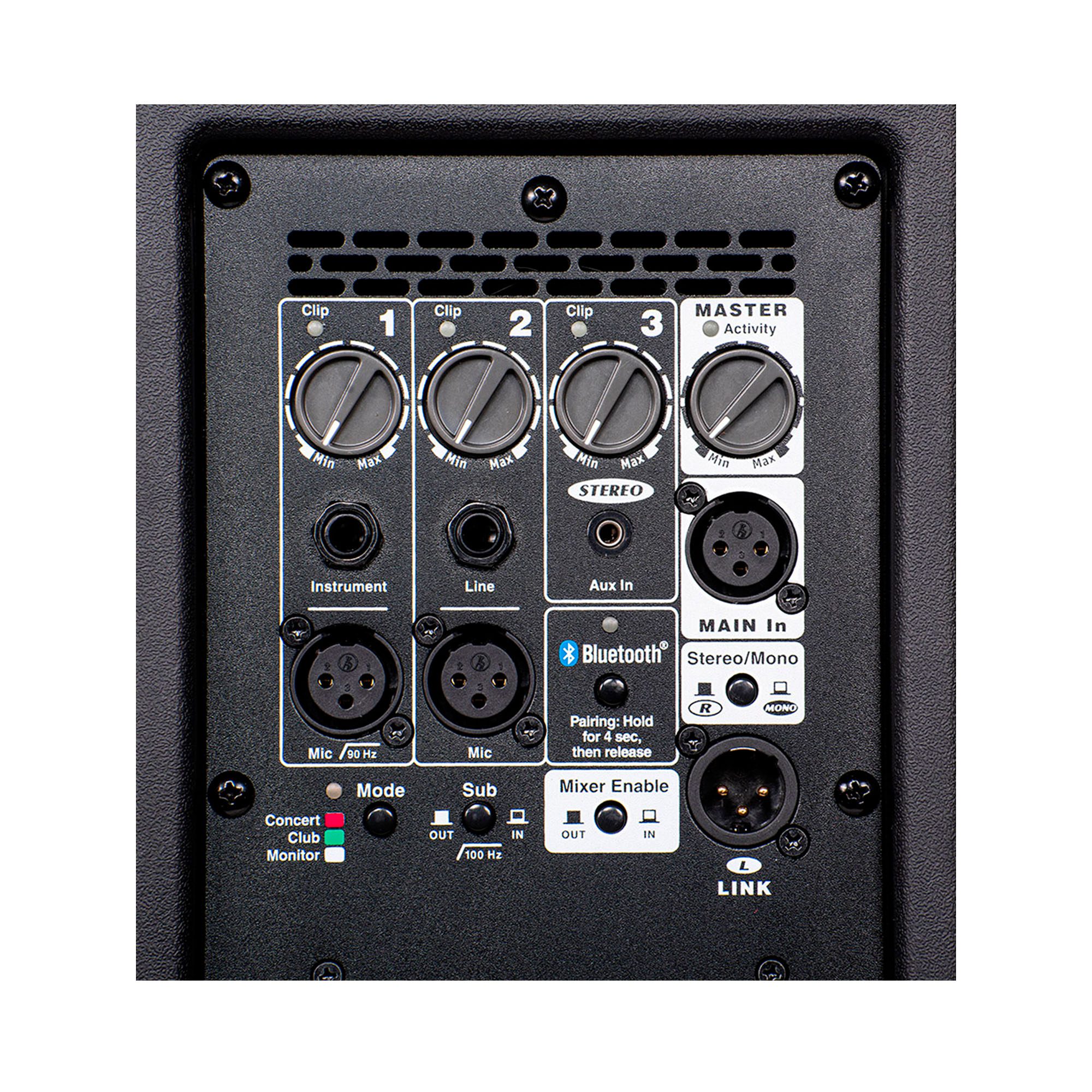 La cabina cuenta con un woofer de 15 pulgadas que proporciona graves profundos y contundentes, acompañado de un driver de compresión de 1 pulgada que garantiza agudos definidos y una excelente claridad vocal. Su sistema de dos vías permite una reproducción equilibrada en todo el rango de frecuencias.